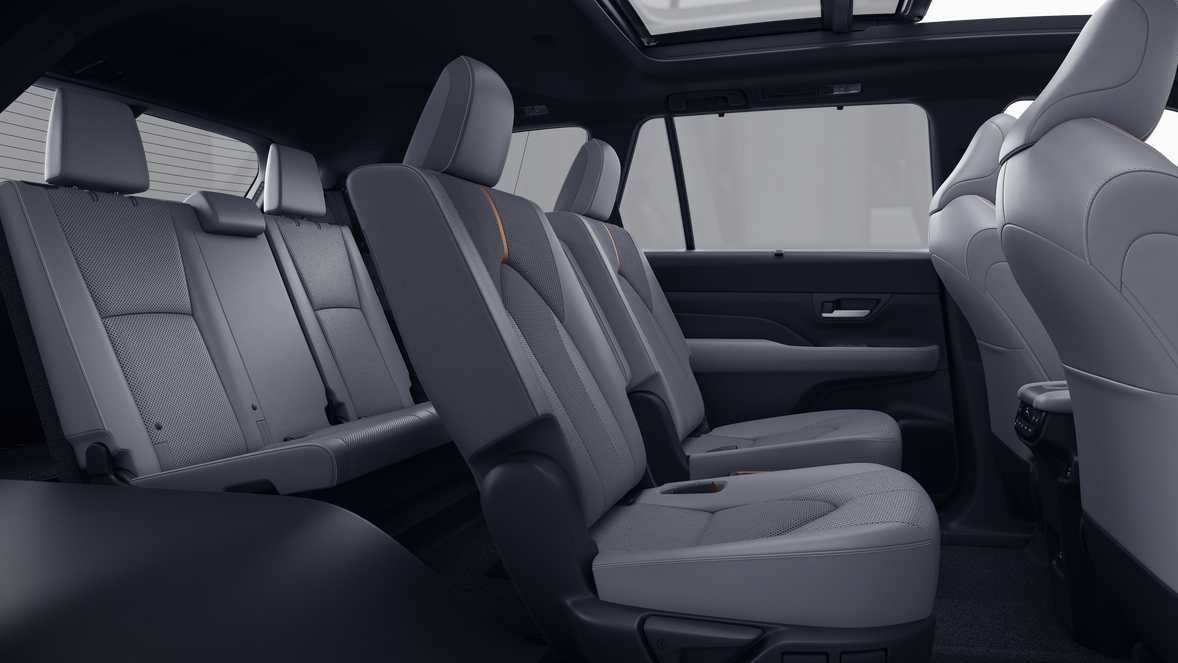 • 7-passenger seating with second-row fold-down captain's chairs and fold-down inboard armrests, adjustable headrests and two cup holders mounted on the floor; and 60/40 split, fold-down third-row seats with sliding headrests and recline function